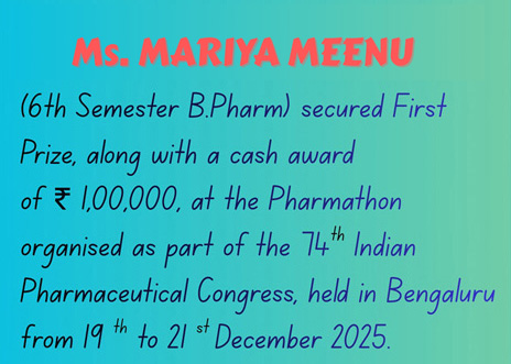 The College offers B.Pharm, M.Pharm, Pharm.D and D.Pharm programmes and is pledged to provide advanced facilities to comply with technological advancements in pharmaceutical sciences. The institute is highly research oriented and enjoys great Academic - Industrial interactions.