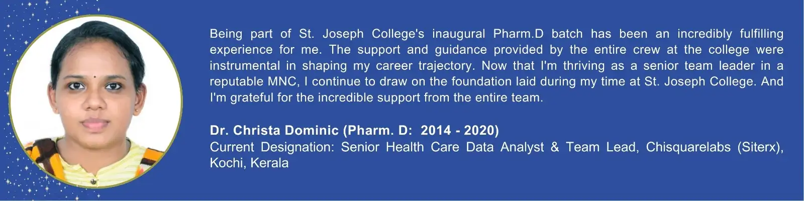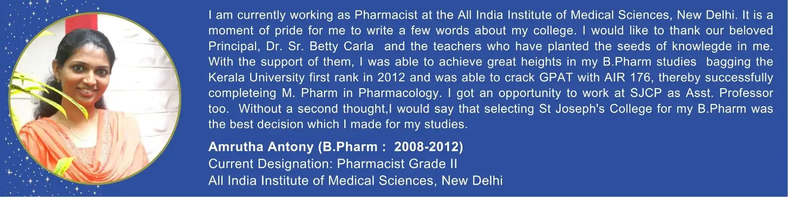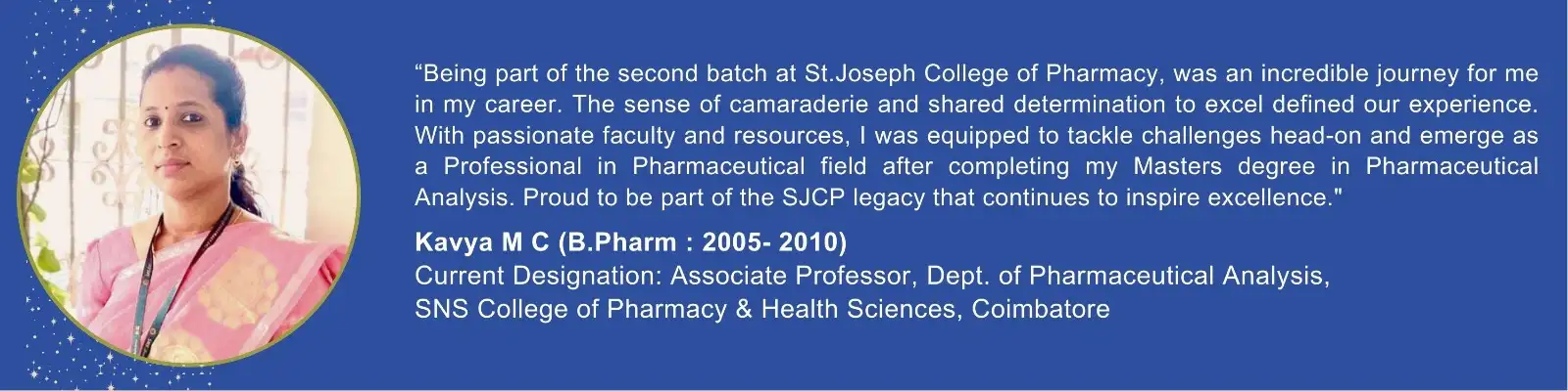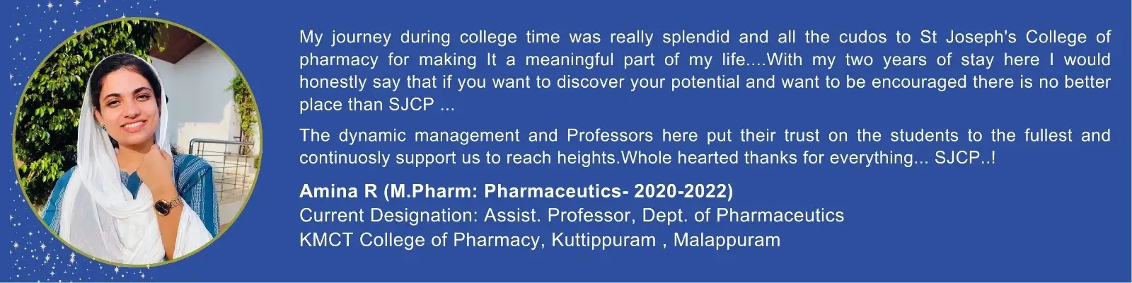 St. Joseph's College of Pharmacy is situated in Cherthala, the land of back waters amidst panoramic beauty in close proximity to Kumarakom, the renowned tourist spot and National Aquatic Bird Sanctuary. It is a unit of the Nirmala Province of the Medical Sisters of St. Joseph (MSJ Dharmagiri) Aluva, Kerala. The congregation of the Medical Sisters of St. Joseph is dedicated to the healing ministry and allied medical education, aiming to uplift the suffering humanity devoid of profit motive.