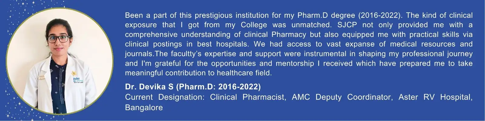 The college offers Six years Pharm.D course with state of the art advanced class rooms and teaching methodology with clinical exposure, laboratories and library with high speed OFC internet support. The students are guided and evaluated by well experienced faculty members.
