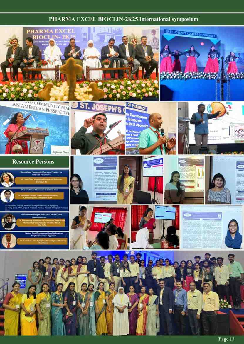 An international symposium titled "Pharma Excel Bioclin–2025" was held on April 4, 2025, at the college auditorium, organized by the Internal Quality Assurance Cell in collaboration with the Departments of Pharmaceutics and Pharmacy Practice. The symposium was inaugurated by Dr. Rajasree R.S., Dean, Faculty of Pharmaceutical Sciences, Kerala University of Health Sciences. The distinguished resource persons included: Dr. Thirumurthy Velpandian, Professor & Head, Ocular Pharmacology, AIIMS, New Delhi- Visiting Professor-Havard University, Dr. V. Sankar, Vice Principal, PSG College of Pharmacy, Coimbatore, Dr. Mohamed Hisham, Lead Clinical Pharmacist, Cleveland Clinic, Abu Dhabi, UAE, and Ms. Soni Pious, Pharmacist, Walgreens, Florida, USA. The theme of the symposium was "Innovating Biopharmaceutics & Clinical Pharmacy for Better Patient Care."